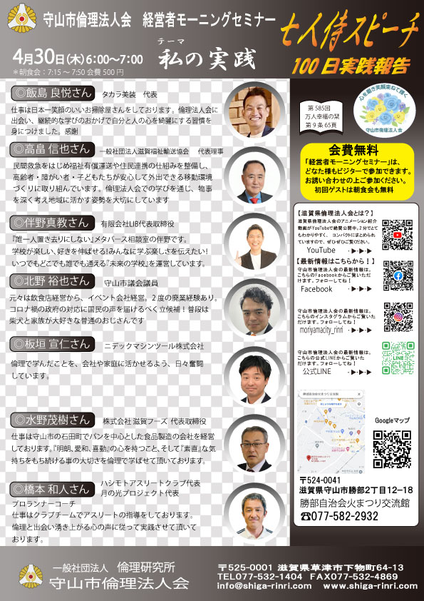 4月30日木曜日 AM6:00~7:00 経営者モーニングセミナー(ゲストの方は参加費無料)